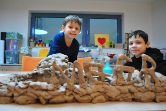 Anja Fedtke arbeitet mit Geschwistern nicht auf der Station, sondern im Elternhaus des Elternvereins. Hier bestehen mehr Möglichkeiten, Dinge auszuprobieren und auch mit besonderen Techniken und Materialien zu arbeiten, die aus hygienischen Gründen auf Station nicht möglich sind, wie z.B. mit Ton.