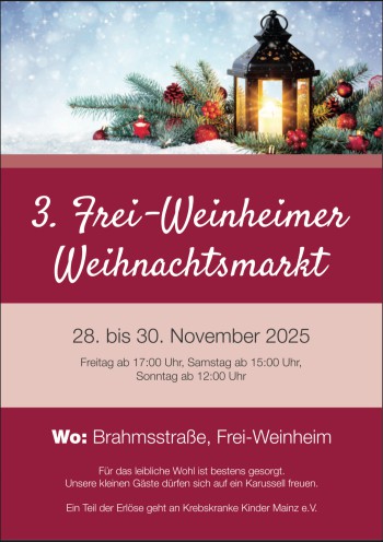 Bereits zum dritten Mal organisiert Stefanie Mathenia mit großer Unterstützung der gesamten Nachbarschaft den "Weihnachtsmarkt in der Brahmsstraße" in Frei-Weinheim vom 28.11. - 30.11.2025. Drei Tage lang dürfen sich die großen und kleinen Besucher an weihnachtlichen Ständen erfreuen. In diesem Jahr gibt es sogar ein Karussell für die Kinder. Für das leibliche Wohl ist -wie immer- bestens gesorgt. Ihr benötigt Weihnachtsgeschenke? Kein Problem, denn auf dem Weihnachtsmarkt von Stefanie Mathenia werdet Ihr garantiert fündig.