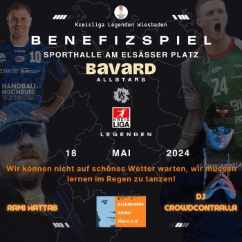 Am 18.05.2024 findet in der Sporthalle am Elsässer Platz das Benefizspiel der Bavard Allstars vs. Kreisligalegenden im Handball statt. Einlass ist um 16:00 Uhr, um 18:00 Uhr beginnt ein spannendes Spiel. Für das leibliche Wohl ist bestens gesorgt.