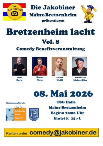 Wir sind wieder dabei :-): Am 08.05.2026 bei der 8. Ausgabe von Bretzenheim lacht, der Comedy Benefizveranstaltung für gute Laune und den guten Zweck! John Deyle, Simon Mann Jesper Wulff und Moderator Michael Eller werden ihrem Publikum wieder einen kurzweiligen Abend bereiten, da sind wir uns ganz sicher.