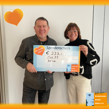 Es ist ein kleiner Männerclub, der Club 33, dessen Mitglieder seit vielen Jahren gemeinsame Aktivitäten unternehmen. Am Ende eines jeden Jahres dürfen drei Mitglieder eine Spende von je €333,00 an einen gemeinnützigen Verein empfehlen. Im vergangenen Jahr war auch Ralf Klein „an der Reihe“. Er wünschte sich eine Spende an den Elternverein, dessen Arbeit für Krebskranke Kinder und deren Familien ihm schon lange bekannt ist.