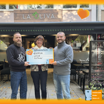 Im vergangenen Jahr durften wir zwei sehr engagierte junge Menschen kennen lernen: Niklas Skark und Fabian Metzmann von der Pizzeria „La Oliva“. Im Rahmen der Neueröffnung ihrer neuen Filiale haben sie sich vorgenommen, den gesamten Gewinn dieses Tages an den Elternverein zu spenden. Aus persönlichen Gründen ist es den beiden ganz besonders wichtig, Krebskranke Kinder Mainz e.V. zu unterstützen. Nach einer anstrengenden Umbauphase konnte am 11.10.2025 nun endlich die Eröffnung in der Großen Langgasse 6 in Mainz gefeiert werden. Mit DJ, Tombola und vielen 100 Pizzen am Start war das Team von "La Oliva" bestens auf den großen Ansturm vorbereitet, der auch nicht ausblieb. Der Wettergott spielte mit, so dass im Innen- wie auch im Außenbereich alle Tische fast durchgehend besetzt waren. Auch die lange Schlange an der Kasse sprach für sich.