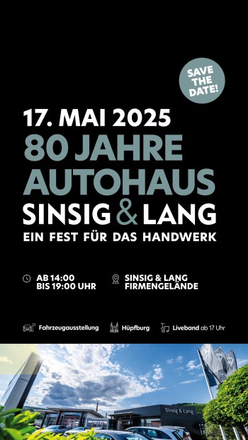 Seit stolzen 80 Jahren existiert das Mercedes Autohaus Sinsig & Lang GmbH & Co. KG in Bingen. Solch ein Ereignis muss natürlich gefeiert werden. Deshalb lädt das Team von Sinsig & Lang GmbH & Co. KG am 17.05.2025, 14.00 - 19:00 Uhr zum Jubiläumsfest ein. Die großen Gäste dürfen sich auf eine Oldtimerausstellung und Livemusik, die kleinen Gäste über eine Hüpfburg freuen. Für das leibliche Wohl ist ebenfalls bestens gesorgt.