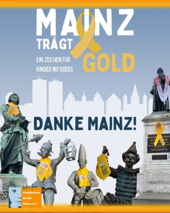 Wir sind immer noch sehr berührt, dass unsere Kampagne in Mainz so angenommen wurde. Überall war die goldene Schleife zu sehen, so viele Menschen trugen sie am Revers und zeigten damit ihre Solidarität mit den betroffenen Kindern und deren Familien. Dass unsere Aktion auch finanziell unterstützt wurde, bewegt uns einmal mehr. Viele Spenden haben uns erreicht und kreative Spendenaktionen wurden ins Leben gerufen.