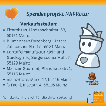 Spendenprojekt NARRatar von "Knoepfchendruecker" Hier findet Ihr die Verkaufsstellen: - Elternhaus, Lindenschmitst. 53, 55131 Mainz - Blumenhaus Rosenberg, Untere Zahlbacher Str. 17, 55131 Mainz - Kartoffelmanufaktur Klein/Glücksgriffe, Sörgenlocher Hohl 7, 55129 Mainz - Mainzer Gourmet, Pfandhausstr. 1, 55116 Mainz - mainzStore, Markt 17, 55116 Mainz - ´s Fachl, Inselstr. 4, 55116 Mainz