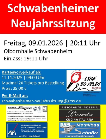 Wir dürfen wieder dabei sein, bei der Schwabenheimer Neujahrssitzung von O-LINE & BO FELDI Events, die am 09.01.2026, 20:11 Uhr in der Olbornhalle (Am Sportfeld 90, 55270 Schwabenheim/Selz) stattfindet. Längst ist diese Sitzung kein Geheimtipp mehr und die Karten in Windeseile ausverkauft.