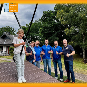 Anfang diesen Jahres durften wir von Rudi Dick, Markus Käfer und Matthias Schnorr eine beeindruckende Spendensumme von 23.517,14€ entgegen nehmen, die die drei im Rahmen ihrer Vision Sonnenschein innerhalb von etwa fünf Monaten für den Elternverein -ganz speziell für die Erholungsanlage in Gemünden- gesammelt haben. Wir sind dafür sehr dankbar, denn durch diese Unterstützung konnten wir die bei den Kindern so sehr beliebte Seilbahn erneuern, die wir sonst hätten nicht ersetzen können. Riesig gefreut haben wir uns, dass wir Rudi, Markus und Matthias am diesjährigen Sommerfest die neue Seilbahn zeigen konnten. Die Seilbahn wird von den Kindern auf dem Spielplatz der Erholungsanlage am meisten genutzt, es ist doch immer ein wenig Abenteuer dabei.